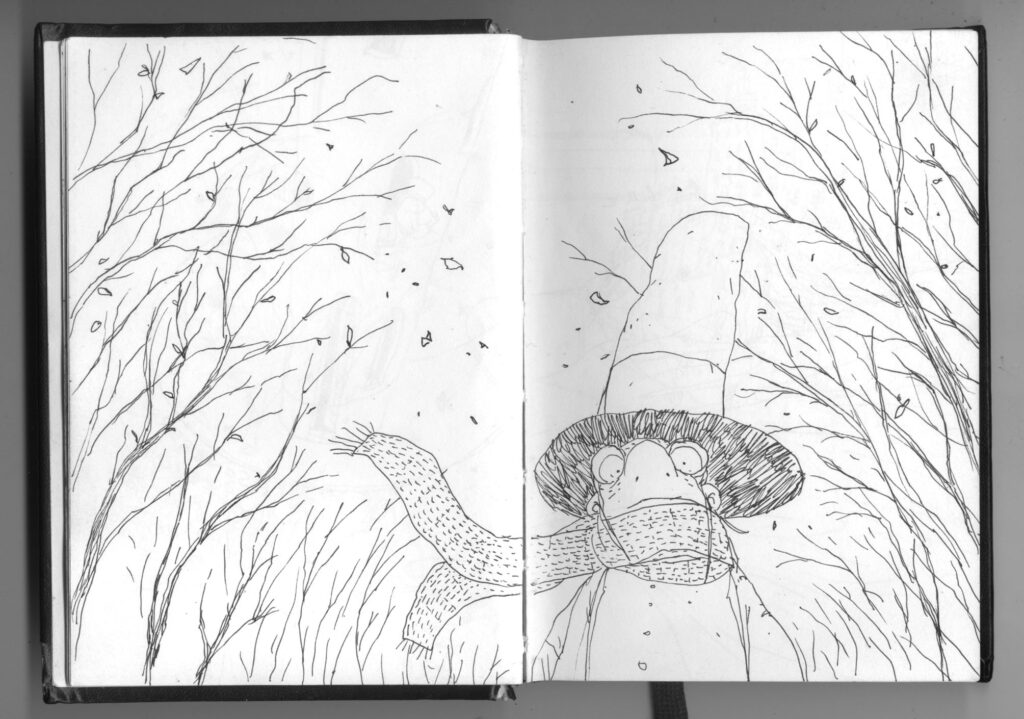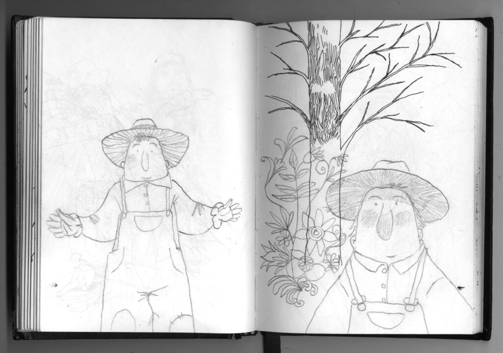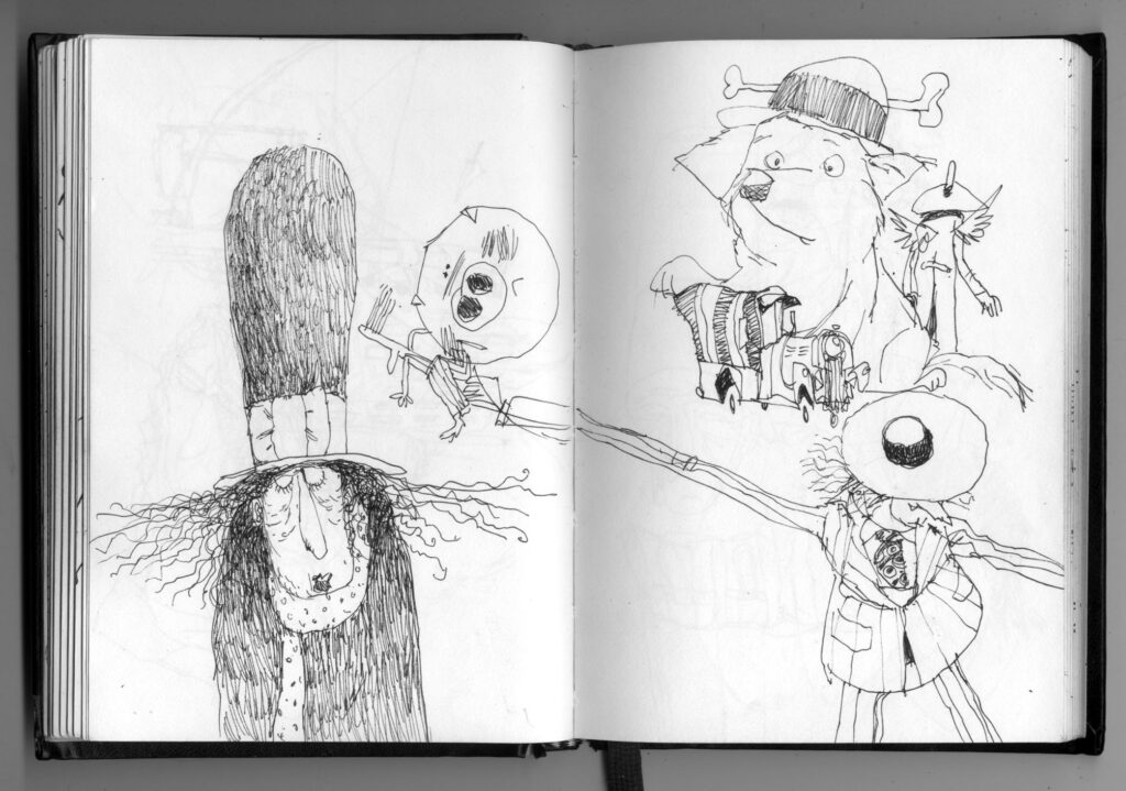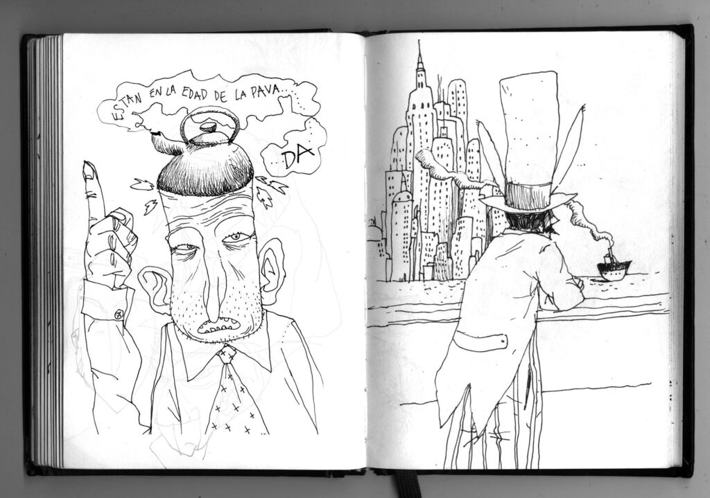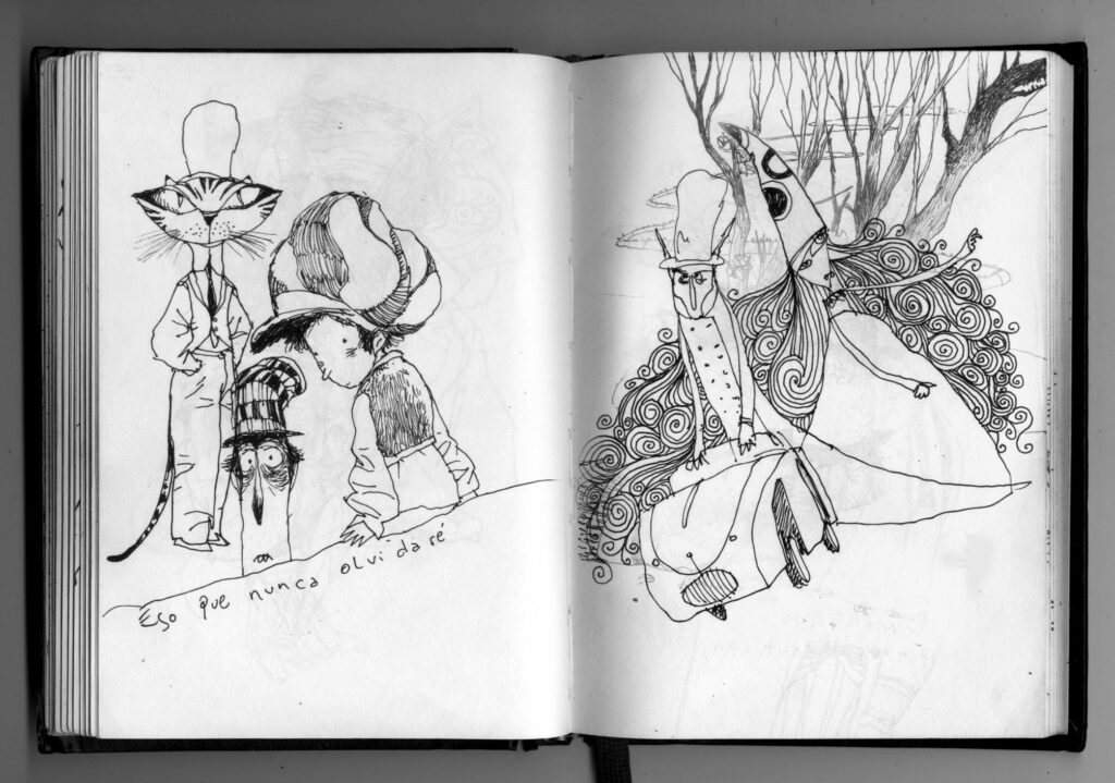 Pero ¿cómo surge “Historias con Sombrero”? un día Lucho viene y me dice: ¡Che! tuve que escribir un cuento para una editorial que tenía que tener un sombrero como protagonista y le hice una docena. Se quedaron con el primero que vieron y me quedaron los otros. ¿Y qué hiciste con los otros cuentos? -le dije. Porque yo no sé si te diste cuenta alguna vez, mientras le mostraba mi libreta de dibujos, todos mis personajes en esta libreta tienen sombreros, siempre con sombreros: ¡Hagamos un libro de cuentos con sombreros! Pero hagámoslo sin tiempo, sin presiones. Hagamos el libro que soñamos. Y pasan esas cosas. Pasan diez años también.